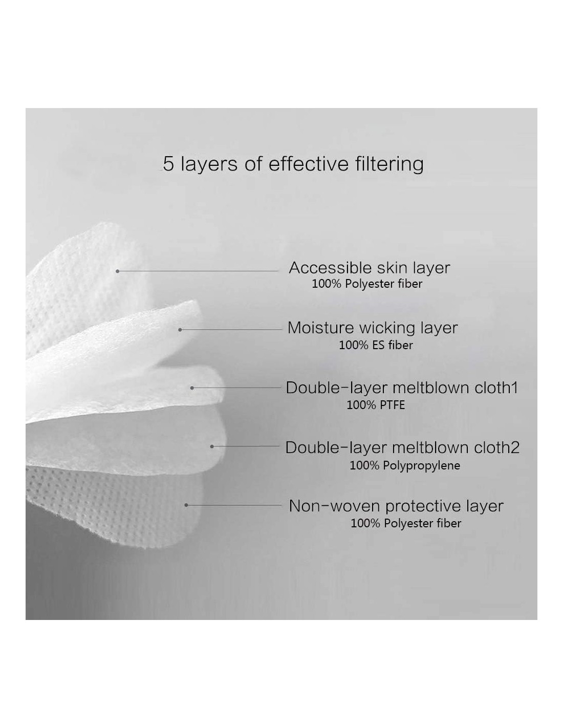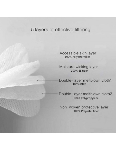 COMPOSITION: Haute filtration avec 5 couches filtrantes. Barrette nasale métallique. Elastique fixation...