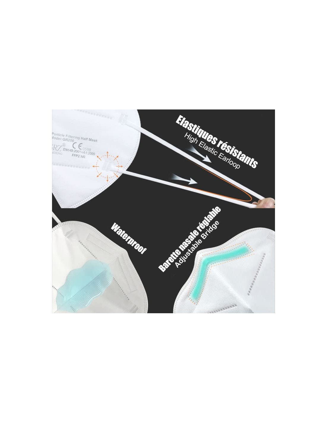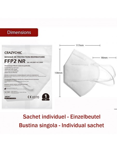 NORME CE: Testé, certifié et conforme à la règlementation européenne EN149:2001+A1:2009 FFP2 NR. Masque non réutilisable à usage unique. Masque non médical.