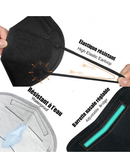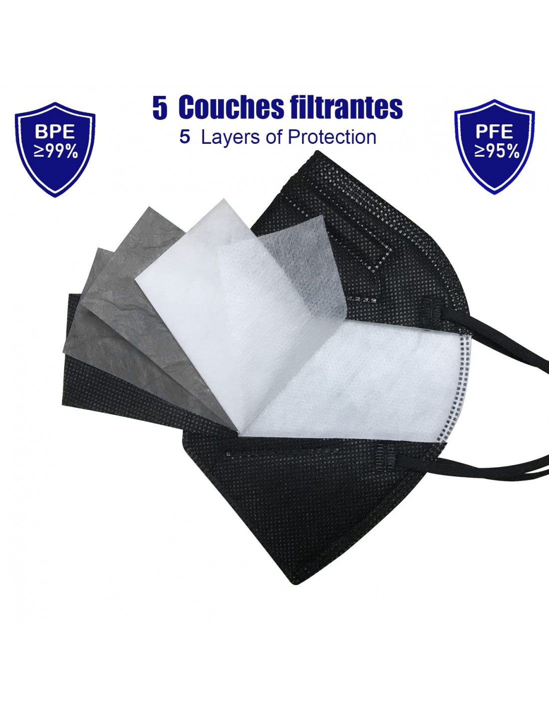 COMPOSITION: 5 couches filtrantes. Barrette nasale métallique. Elastique fixation auriculaire.