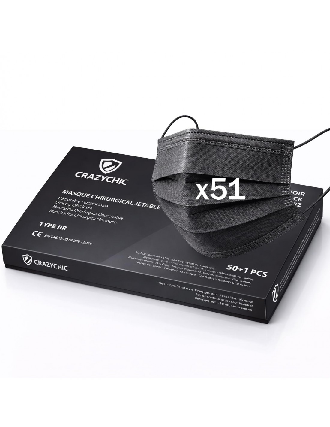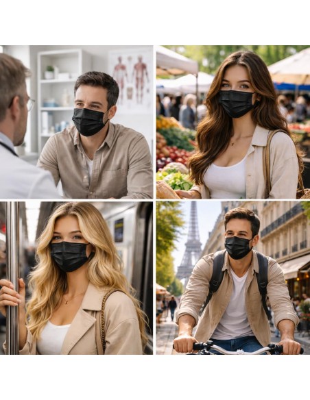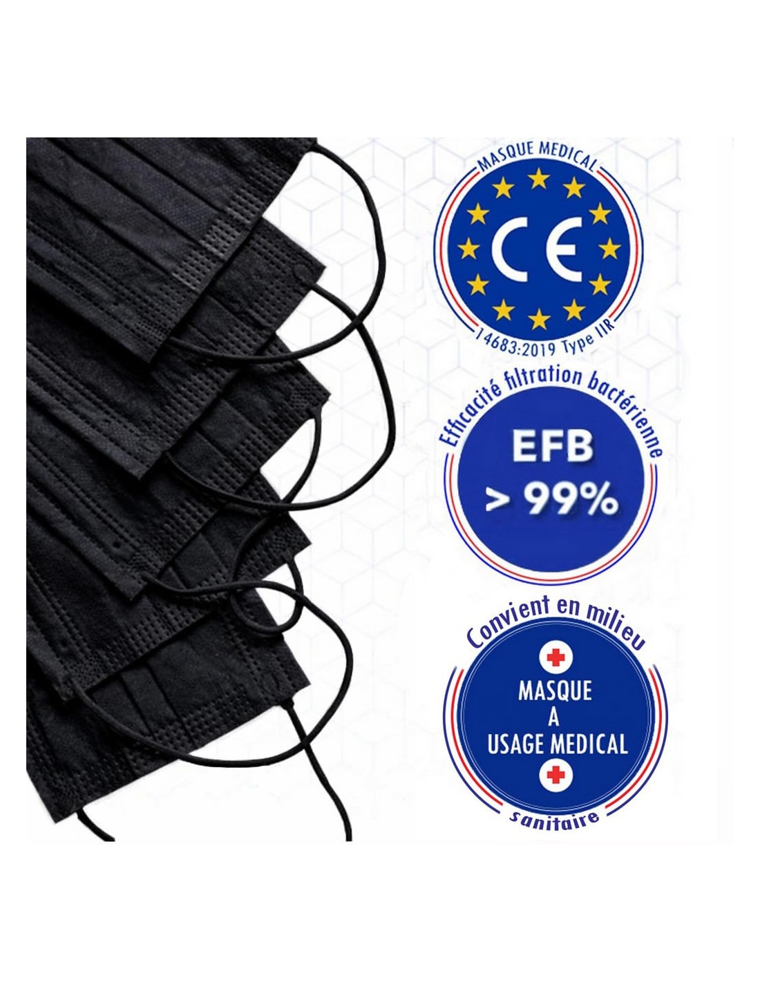 NORME CE: Certification EN 14683:2019 Type IIR. Haute filtration. Efficacité de filtration bactérienne BFE>99%. Testé et certifié par le laboratoire SGS.