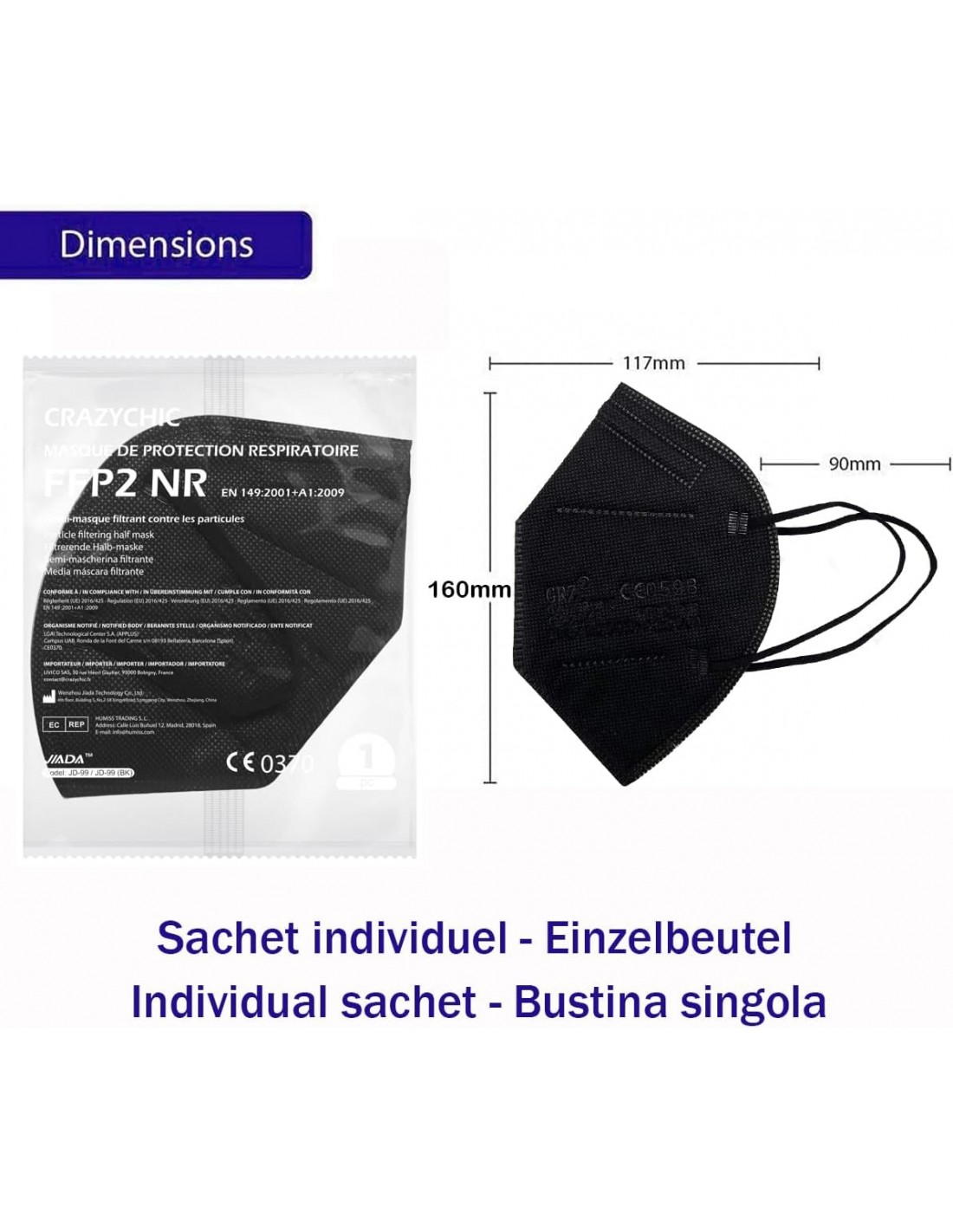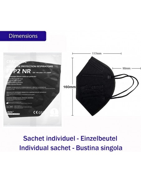 NORME CE: Testé, certifié et conforme à la norme européenne EN149:2001+A1:2009 FFP2 NR. Masque non réutilisable à usage unique. Haute filtration.